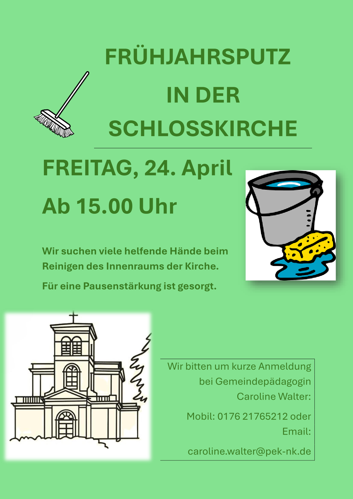 20. April 202620. April 2026 KIRCHENPUTZ PUTBUS Freitag, 24. April ab 15.00 Uhr Bitte anmelden bei Gemeindepädagogin Caroline Walter